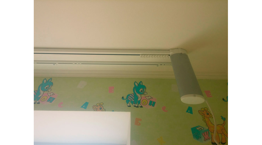 Моторизованный карниз Somfy Glydea установленный в детской комнате в потолок. Имеет аккуратный внешний вид и идеально вписывается в любой интерьер.
