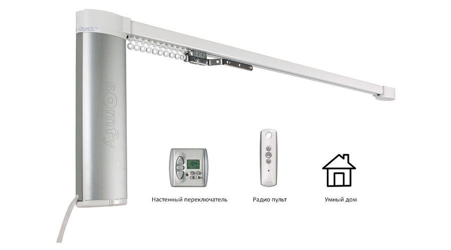 Карниз от Somfy может управляться как с помощью пульта, так и с помощью умного дома и настенного проводного выключателя.